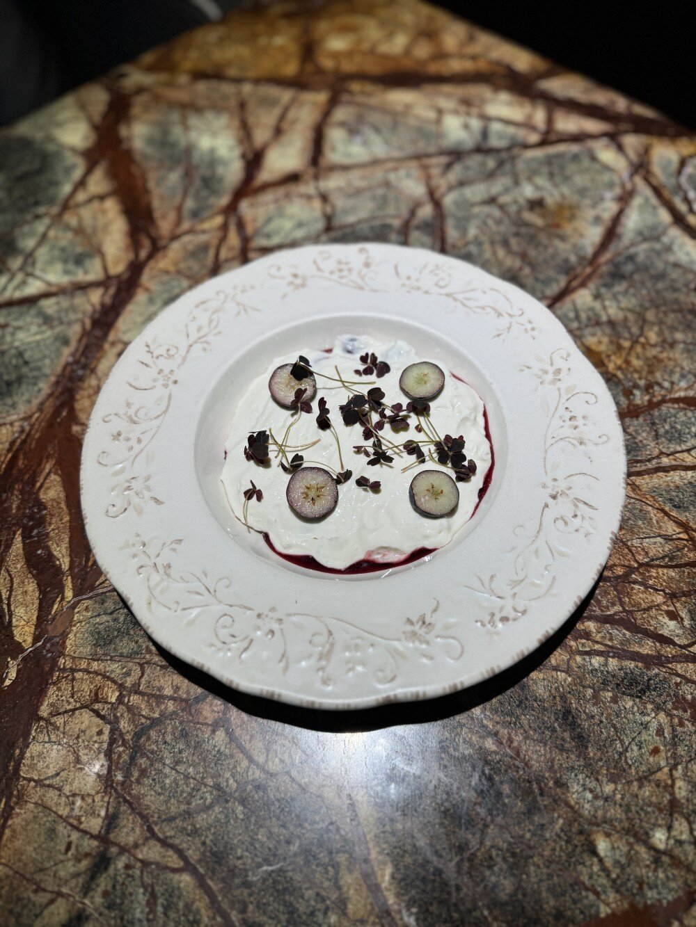 Сырники с ванильным кремом, вяленой клюквой и вишнёвым вареньем