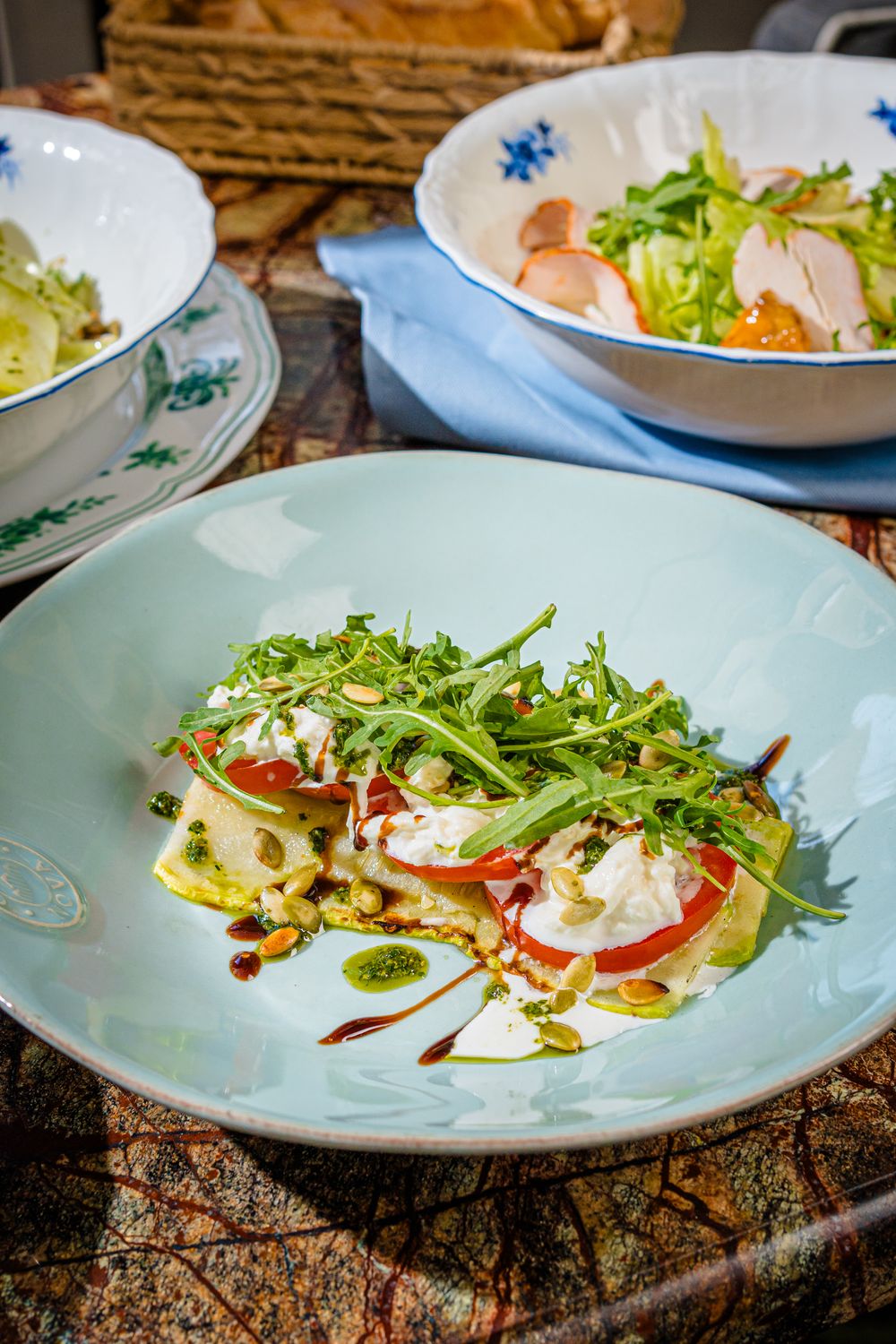 Цукини с фермерской сливочной страчателлой и розовыми томатами