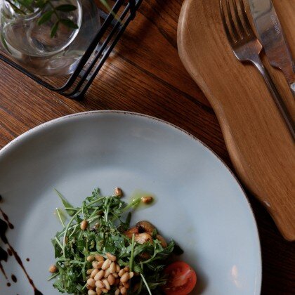 Салат с креветками, баклажанами и грибами с бальзамиком из шиповника и песто