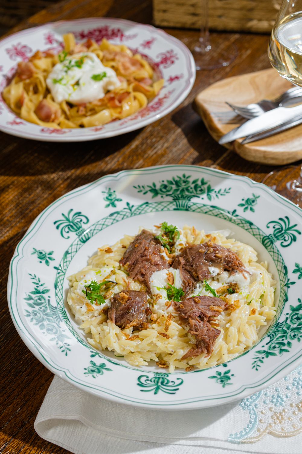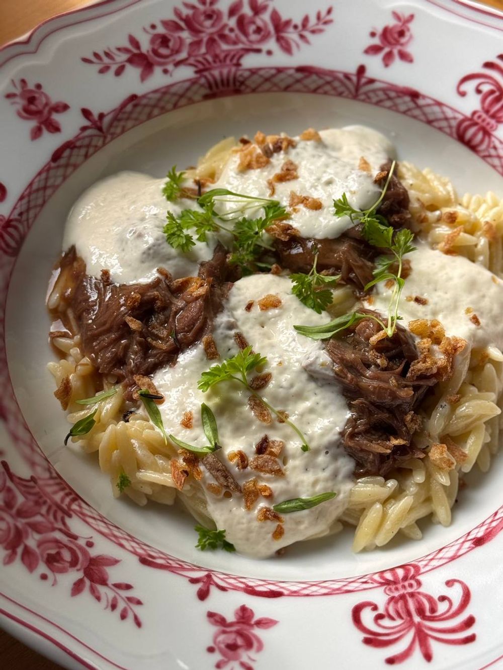 Орзо с говяжьими щёчками в перечном соусе с муссом Пармезан
